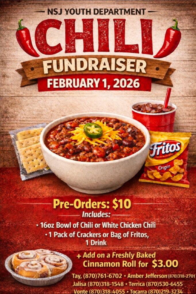 Support the NSJ Youth Department by taking part in our Chili Fundraiser on Sunday, February 1, 2026! Pre-orders are just $10 and include a 16oz bowl of chili or white chicken chili, crackers or a bag of Fritos, and one drink—perfect for a warm, comforting meal after service.